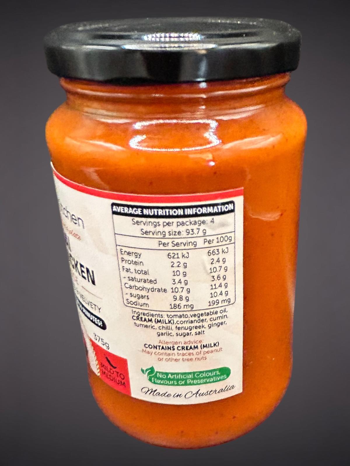 INGREDIENTS: TOMATO,VEGETABLE OIL, CREAM (MILK),CORRIANDER, CUMIN, TUMERIC, CHILLI, FENUGREEK, GINGER, GARLIC, SUGAR, SALT